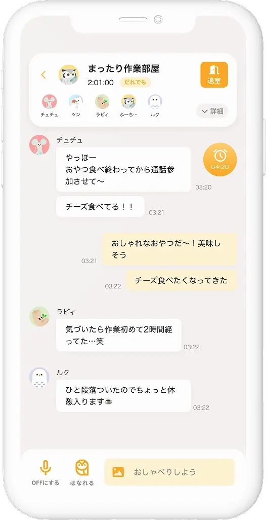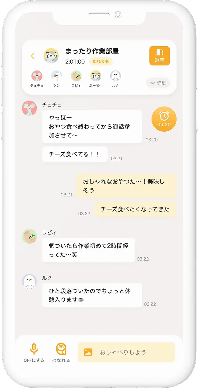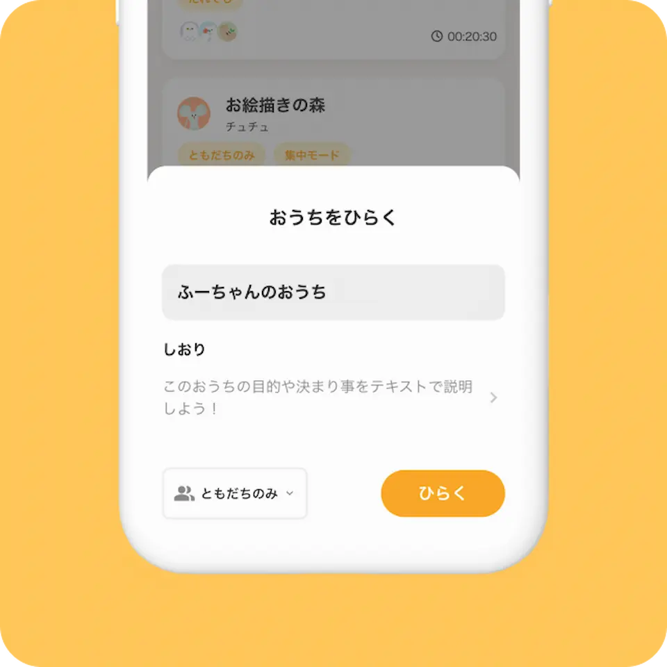通話したいなと思ったら『おうちをひらく』 ともだちに通知が届いて、気づいた人が遊びにきてくれます。 しおりに今日の作業内容を書いておくのもおすすめ。